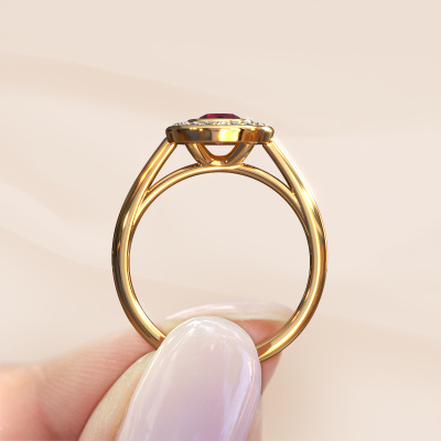 The ring shown above is called the Noud 1 RND. We call this type of ring a halo ring because it has one centre gemstone and a band that is also pave set with gemstones. The 14 Carat gold promise ring is set with a round 4.7 mm rhodolite centre stone and the band is pave set with diamonds. What makes this traditional gold halo ring special are the smaller sized stones embracing the centre stone. This gorgeous promise ring is called a halo ring because the smaller gemstones give the centre stone a halo of surrounding light. In order for the smaller stones to enhance the centre stone, they have to be placed so there is no interference of light. And that's when our expert goldsmiths come in. Each individual stone is carefully set in the ring by hand. During manufacturing, light fall is constantly monitored to make sure the special halo is still visible. In the end you get a unique promise ring, with a rhodolite of your choosing at its centre. You can imagine the effect of a ring of such significance when you give it to her on her special day to shine. By using a combination of the latest modern techniques, combined with ancient crafting, we can make all our promise ring in our own studio. Each jewel is made to order. This is advantageous because we can offer you a price you won't find anywhere else.Do you have a specific ring in mind? One you came across somewhere. Please feel free to tell us your wishes and we will turn your design into a unique promise ring. You can follow the development of your ring design because we use 3D drawings. This gives you a realistic preview of your design. We will gladly send you a non-binding offer, based on a fair price/ quality ratio. It will amaze you.To make it easier for you, we offer a 30 day return policy. Check our terms and conditions.