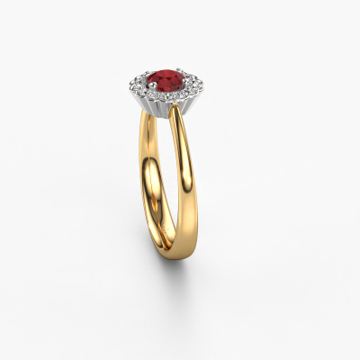 The ring shown above is called the Debi. We call this type of ring a halo ring because it has one centre gemstone and a band that is also pave set with gemstones. The 14 Carat gold engagement ring is set with a round 4.2 mm ruby centre stone and the band is pave set with diamonds. What makes this classic gold halo ring special are the smaller sized stones embracing the centre stone. This gorgeous engagement ring is called a halo ring because the smaller gemstones give the centre stone a halo of surrounding light. In order for the smaller stones to enhance the centre stone, they have to be placed so there is no interference of light. And that's when our expert goldsmiths come in. Each individual stone is carefully set in the ring by hand. During manufacturing, light fall is constantly monitored to make sure the special halo is still visible. In the end you get a unique engagement ring, with a ruby of your choosing at its centre. You can imagine the effect of a ring of such significance when you give it to her on her special day to shine. Because we design and deliver our own rings, we can offer you a engagement ring at a price you won't find anywhere else. A ring is made to order, which helps prevent excess supplies, so we can make you a great price offer. We understand it feels risky, buying your engagement ring online, but we will gladly assist in the designing process, taking your budget into consideration.Our team adds new designs to our online collection daily. Our designers and goldsmiths work together in creating the best design. We strive to offer a diverse collection of jewels. Perhaps you have a specific jewel design in mind. One you came across somewhere. Please contact us for a free consultation. We will make you an offer, based on a fair price/ quality ratio, that will baffle you.To make it easier for you, we offer a 30 day return policy. Check our terms and conditions.