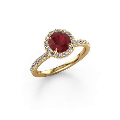 The ring shown above is called the Miranda rnd. We call this type of ring a halo ring because it has one centre gemstone and a band that is also pave set with gemstones. The 14 Carat gold engagement ring is set with a round 6.5 mm ruby centre stone and the band is pave set with lab-grown diamonds. What makes this exclusive gold halo ring special are the smaller sized stones embracing the centre stone. This gorgeous engagement ring is called a halo ring because the smaller gemstones give the centre stone a halo of surrounding light. In order for the smaller stones to enhance the centre stone, they have to be placed so there is no interference of light. And that's when our expert goldsmiths come in. Each individual stone is carefully set in the ring by hand. During manufacturing, light fall is constantly monitored to make sure the special halo is still visible. In the end you get a unique engagement ring, with a ruby of your choosing at its centre. You can imagine the effect of a ring of such significance when you give it to her on her special day to shine. By using our modern techniques, we can design and customize the finest quality jewels with the utmost care for you. Our engagement rings are always priced 30 percent lower than other jewellers. We make engagement rings to order so we don't have to maintain a large stock. If you have a certain budget, we are more than happy to advice you accordingly.Have you found a specific engagement ring somewhere which you would like to give to your loved one? Please feel free to express your wishes to our jewel designers because we would be honoured to turn your design into a exclusive engagement ring. You can follow the development of your ring design because we use 3D drawings. This gives you a realistic preview of how your design will look. You can also preorder a dummy. A dummy is a plastic ring, which can be shaped according your ring design. You can try it on and check if its width and size are suitable for you. We will gladly send you a non-binding offer, based on a fair price/ quality ratio. It will amaze you, considering the quality of the ring and gemstones.To make it easier for you, we offer a 30 day return policy. Check our terms and conditions.