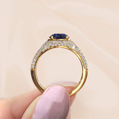 This 14 Carat gold ring is called Lovella and is set with 7 mm sapphire. Does your girlfriend fancy exclusive jewellery? Or would you like to show her that she deserves the finest jewellery? This gold ring is pure craftsmanship, love and passion combined with the latest techniques coming together in perfect harmony. It requires a keen eye, patience and a skilful hand to mould this ring into perfection. Just the job for our expert goldsmith! The sapphire set gemstones gives this gold ring an extra glamorous appearance. Customize the style of the micro pave engagement ring to her liking with a wide variety of precious metals and gemstones which you select. That is how you create a unique ring for the most exclusive woman in your life! This jewel is made just for you, with attention to detail and design.By using a combination of the latest modern techniques, combined with ancient crafting, we can make all our engagement rings in our own studio. Each jewel is made to order. This is advantageous because we can offer you a price you won't find anywhere else.Our team adds new designs to our online collection daily. Our designers and goldsmiths work together in creating the best design. We strive to offer a diverse collection of jewels. Perhaps you have a specific jewel design in mind. One you came across somewhere. Please contact us for a free consultation. We will make you an offer, based on a fair price/ quality ratio, that will baffle you.To make it easier for you, we offer a 30 day return policy. Check our terms and conditions.