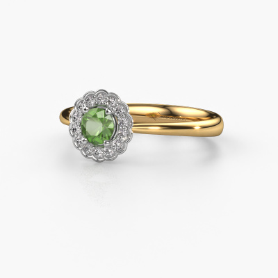 The ring shown above is called the Debi. We call this type of ring a halo ring because it has one centre gemstone and a band that is also pave set with gemstones. The 14 Carat gold engagement ring is set with a round 4.2 mm tourmaline green centre stone and the band is pave set with diamonds. What makes this classic gold halo ring special are the smaller sized stones embracing the centre stone. This gorgeous engagement ring is called a halo ring because the smaller gemstones give the centre stone a halo of surrounding light. In order for the smaller stones to enhance the centre stone, they have to be placed so there is no interference of light. And that's when our expert goldsmiths come in. Each individual stone is carefully set in the ring by hand. During manufacturing, light fall is constantly monitored to make sure the special halo is still visible. In the end you get a unique engagement ring, with a tourmaline green of your choosing at its centre. You can imagine the effect of a ring of such significance when you give it to her on her special day to shine. Because we design and deliver our own rings, we can offer you a engagement ring at a price you won't find anywhere else. A ring is made to order, which helps prevent excess supplies, so we can make you a great price offer. We understand it feels risky, buying your engagement ring online, but we will gladly assist in the designing process, taking your budget into consideration.Our team adds new designs to our online collection daily. Our designers and goldsmiths work together in creating the best design. We strive to offer a diverse collection of jewels. Perhaps you have a specific jewel design in mind. One you came across somewhere. Please contact us for a free consultation. We will make you an offer, based on a fair price/ quality ratio, that will baffle you.To make it easier for you, we offer a 30 day return policy. Check our terms and conditions.