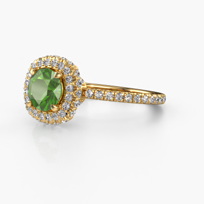 The ring shown above is called the Talitha RND. We call this type of ring a halo ring because it has one centre gemstone and a band that is also pave set with gemstones. The 14 Carat gold engagement ring is set with a round 6.5 mm tourmaline green centre stone and the band is pave set with lab-grown diamonds. What makes this exclusive gold halo ring special are the smaller sized stones embracing the centre stone. This gorgeous engagement ring is called a halo ring because the smaller gemstones give the centre stone a halo of surrounding light. In order for the smaller stones to enhance the centre stone, they have to be placed so there is no interference of light. And that's when our expert goldsmiths come in. Each individual stone is carefully set in the ring by hand. During manufacturing, light fall is constantly monitored to make sure the special halo is still visible. In the end you get a unique engagement ring, with a tourmaline green of your choosing at its centre. You can imagine the effect of a ring of such significance when you give it to her on her special day to shine. Are you on a budget? Please feel free to contact us, so we can go discuss your options. We offer our engagement rings at guaranteed best price, because we make them to order. You won't find such a price anywhere else!Our team adds new designs to our online collection daily. Our designers and goldsmiths work together in creating the best design. We strive to offer a diverse collection of jewels. Perhaps you have a specific jewel design in mind. One you came across somewhere. Please contact us for a free consultation. We will make you an offer, based on a fair price/ quality ratio, that will baffle you.To make it easier for you, we offer a 30 day return policy. Check our terms and conditions.