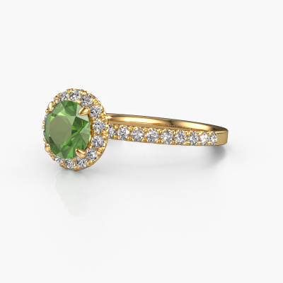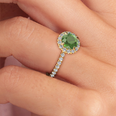 The ring shown above is called the Miranda rnd. We call this type of ring a halo ring because it has one centre gemstone and a band that is also pave set with gemstones. The 14 Carat gold engagement ring is set with a round 6.5 mm tourmaline green centre stone and the band is pave set with lab-grown diamonds. What makes this exclusive gold halo ring special are the smaller sized stones embracing the centre stone. This gorgeous engagement ring is called a halo ring because the smaller gemstones give the centre stone a halo of surrounding light. In order for the smaller stones to enhance the centre stone, they have to be placed so there is no interference of light. And that's when our expert goldsmiths come in. Each individual stone is carefully set in the ring by hand. During manufacturing, light fall is constantly monitored to make sure the special halo is still visible. In the end you get a unique engagement ring, with a tourmaline green of your choosing at its centre. You can imagine the effect of a ring of such significance when you give it to her on her special day to shine. By using our modern techniques, we can design and customize the finest quality jewels with the utmost care for you. Our engagement rings are always priced 30 percent lower than other jewellers. We make engagement rings to order so we don't have to maintain a large stock. If you have a certain budget, we are more than happy to advice you accordingly.Have you found a specific engagement ring somewhere which you would like to give to your loved one? Please feel free to express your wishes to our jewel designers because we would be honoured to turn your design into a exclusive engagement ring. You can follow the development of your ring design because we use 3D drawings. This gives you a realistic preview of how your design will look. You can also preorder a dummy. A dummy is a plastic ring, which can be shaped according your ring design. You can try it on and check if its width and size are suitable for you. We will gladly send you a non-binding offer, based on a fair price/ quality ratio. It will amaze you, considering the quality of the ring and gemstones.To make it easier for you, we offer a 30 day return policy. Check our terms and conditions.