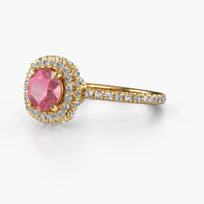 The ring shown above is called the Talitha RND. We call this type of ring a halo ring because it has one centre gemstone and a band that is also pave set with gemstones. The 14 Carat gold engagement ring is set with a round 6.5 mm tourmaline pink centre stone and the band is pave set with lab-grown diamonds. What makes this exclusive gold halo ring special are the smaller sized stones embracing the centre stone. This gorgeous engagement ring is called a halo ring because the smaller gemstones give the centre stone a halo of surrounding light. In order for the smaller stones to enhance the centre stone, they have to be placed so there is no interference of light. And that's when our expert goldsmiths come in. Each individual stone is carefully set in the ring by hand. During manufacturing, light fall is constantly monitored to make sure the special halo is still visible. In the end you get a unique engagement ring, with a tourmaline pink of your choosing at its centre. You can imagine the effect of a ring of such significance when you give it to her on her special day to shine. Are you on a budget? Please feel free to contact us, so we can go discuss your options. We offer our engagement rings at guaranteed best price, because we make them to order. You won't find such a price anywhere else!Our team adds new designs to our online collection daily. Our designers and goldsmiths work together in creating the best design. We strive to offer a diverse collection of jewels. Perhaps you have a specific jewel design in mind. One you came across somewhere. Please contact us for a free consultation. We will make you an offer, based on a fair price/ quality ratio, that will baffle you.To make it easier for you, we offer a 30 day return policy. Check our terms and conditions.
