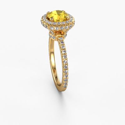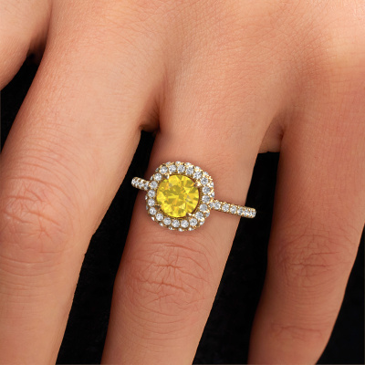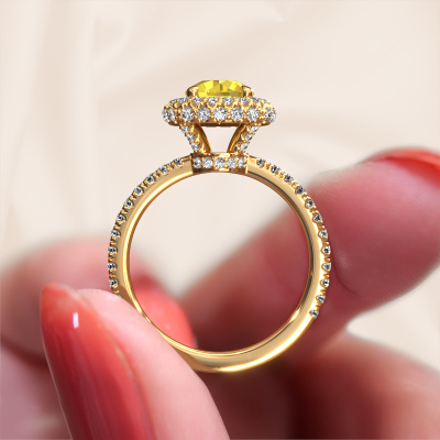 The ring shown above is called the Talitha RND. We call this type of ring a halo ring because it has one centre gemstone and a band that is also pave set with gemstones. The 14 Carat gold engagement ring is set with a round 6.5 mm yellow sapphire centre stone and the band is pave set with lab-grown diamonds. What makes this exclusive gold halo ring special are the smaller sized stones embracing the centre stone. This gorgeous engagement ring is called a halo ring because the smaller gemstones give the centre stone a halo of surrounding light. In order for the smaller stones to enhance the centre stone, they have to be placed so there is no interference of light. And that's when our expert goldsmiths come in. Each individual stone is carefully set in the ring by hand. During manufacturing, light fall is constantly monitored to make sure the special halo is still visible. In the end you get a unique engagement ring, with a yellow sapphire of your choosing at its centre. You can imagine the effect of a ring of such significance when you give it to her on her special day to shine. Are you on a budget? Please feel free to contact us, so we can go discuss your options. We offer our engagement rings at guaranteed best price, because we make them to order. You won't find such a price anywhere else!Our team adds new designs to our online collection daily. Our designers and goldsmiths work together in creating the best design. We strive to offer a diverse collection of jewels. Perhaps you have a specific jewel design in mind. One you came across somewhere. Please contact us for a free consultation. We will make you an offer, based on a fair price/ quality ratio, that will baffle you.To make it easier for you, we offer a 30 day return policy. Check our terms and conditions.