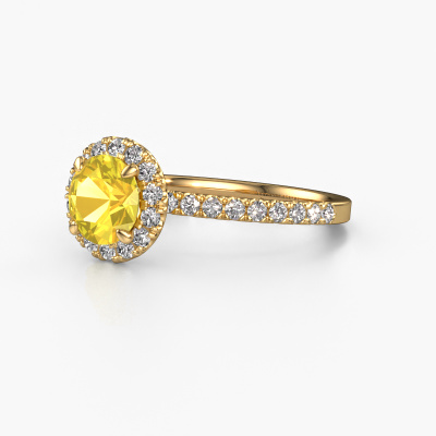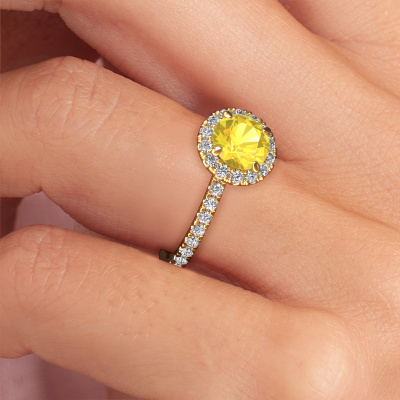 The ring shown above is called the Miranda rnd. We call this type of ring a halo ring because it has one centre gemstone and a band that is also pave set with gemstones. The 14 Carat gold engagement ring is set with a round 6.5 mm yellow sapphire centre stone and the band is pave set with lab-grown diamonds. What makes this exclusive gold halo ring special are the smaller sized stones embracing the centre stone. This gorgeous engagement ring is called a halo ring because the smaller gemstones give the centre stone a halo of surrounding light. In order for the smaller stones to enhance the centre stone, they have to be placed so there is no interference of light. And that's when our expert goldsmiths come in. Each individual stone is carefully set in the ring by hand. During manufacturing, light fall is constantly monitored to make sure the special halo is still visible. In the end you get a unique engagement ring, with a yellow sapphire of your choosing at its centre. You can imagine the effect of a ring of such significance when you give it to her on her special day to shine. By using our modern techniques, we can design and customize the finest quality jewels with the utmost care for you. Our engagement rings are always priced 30 percent lower than other jewellers. We make engagement rings to order so we don't have to maintain a large stock. If you have a certain budget, we are more than happy to advice you accordingly.Have you found a specific engagement ring somewhere which you would like to give to your loved one? Please feel free to express your wishes to our jewel designers because we would be honoured to turn your design into a exclusive engagement ring. You can follow the development of your ring design because we use 3D drawings. This gives you a realistic preview of how your design will look. You can also preorder a dummy. A dummy is a plastic ring, which can be shaped according your ring design. You can try it on and check if its width and size are suitable for you. We will gladly send you a non-binding offer, based on a fair price/ quality ratio. It will amaze you, considering the quality of the ring and gemstones.To make it easier for you, we offer a 30 day return policy. Check our terms and conditions.