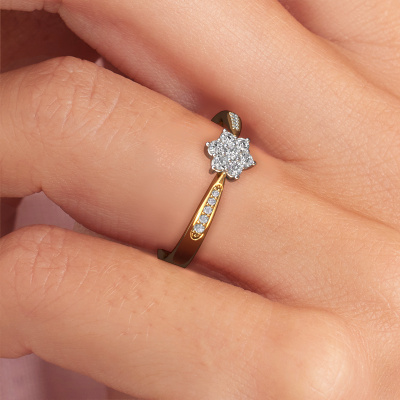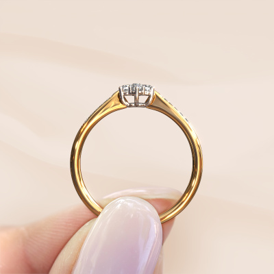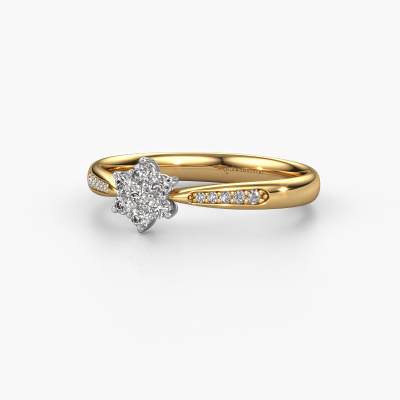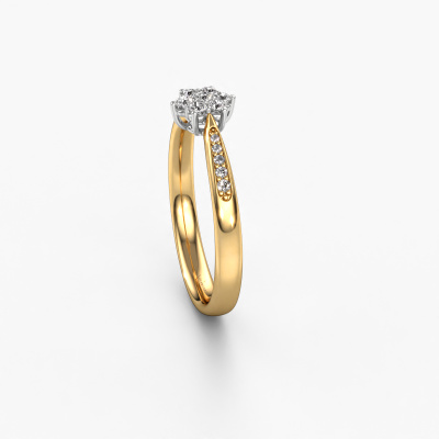 The ring shown above is called the Chantal 2. We call this type of ring a cluster ring, the centre gemstone is surrounded by smaller sized stones. This 14 Carat gold version is set with a 1.7 mm round zirconia centre stone, embraced by smaller lab-grown diamonds. If you look at this gold cluster engagement ring, you might get the impression that its smaller sized stones collide with the bigger zirconia, so it is shaped like a flower. Therefore this engagement ring is also known as the flower ring. Our artisan goldsmiths get the job done. Each individual stone is carefully set by hand. During manufacturing, light fall is constantly monitored to make sure the special cluster effect is still visible. In the end you get the perfect engagement ring with a radiant zirconia gemstone centrepiece. You can imagine the effect of a ring of such significance when you give tot the love of your life on her special day to shine. After receiving your order, our goldsmiths will passionately start the creative process of making your engagement ring in our own studio. Because we don't have a big stockpile, these costs will not be passed on to you. Our pricing is proof of that! We offer top quality jewels at lowest price, guaranteed.Have you found a specific engagement ring somewhere which you would like to give to your loved one? Please feel free to express your wishes to our jewel designers because we would be honoured to turn your design into a traditional engagement ring. You can follow the development of your ring design because we use 3D drawings. This gives you a realistic preview of how your design will look. You can also preorder a dummy. A dummy is a plastic ring, which can be shaped according your ring design. You can try it on and check if its width and size are suitable for you. We will gladly send you a non-binding offer, based on a fair price/ quality ratio. It will amaze you, considering the quality of the ring and gemstones.To make it easier for you, we offer a 30 day return policy. Check our terms and conditions.