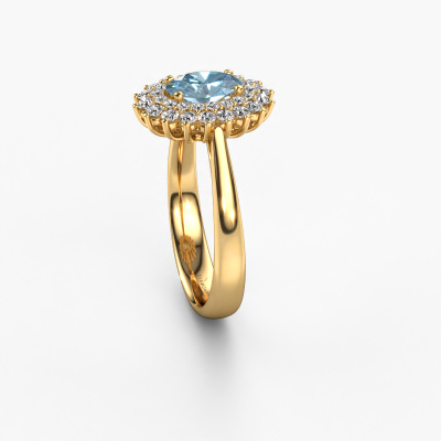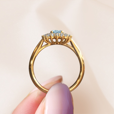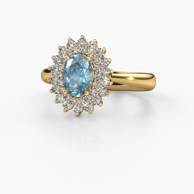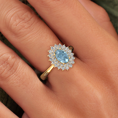 The ring shown above is called the Alina 1. We call this type of ring a cluster ring, the centre gemstone is surrounded by smaller sized stones. This 14 Carat gold version is set with a 7x5 mm oval blue lab grown diamond centre stone, embraced by smaller diamonds. The classic gold cluster engagement ring stands out because of its shape. Together, the smaller and bigger sized blue lab grown diamond gemstones form a flower and they appear to collide into one big sparkling gem. This classic engagement ring is also known as the flower ring. Our expert Goldsmiths make sure the smaller diamonds stones are set identically so there is no light interference in the blue lab grown diamond but unity instead. With perfect precision and a skilful hand each blue lab grown diamond is set in the ring. During manufacturing, it is constantly monitored to make sure light reflects flawlessly. This results in a unique engagement ring, with a radiant blue lab grown diamond at its centre. A lovely, meaningful gift to bestow upon the love of your life. Are you on a budget? Please feel free to contact us, so we can go discuss your options. We offer our engagement rings at guaranteed best price, because we make them to order. You won't find such a price anywhere else!Our designers and goldsmiths work together each day, creating new jewels. Perhaps you have found a nice classic engagement ring somewhere, which can be used to customize your unique ring. Please feel free to contact us. We will make you an offer, based on a fair price/ quality ratio, which will amaze you.To make it easier for you, we offer a 30 day return policy. Check our terms and conditions.