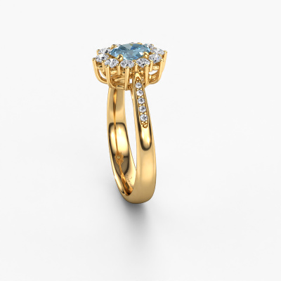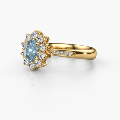 The ring shown above is called the Leesa 2. We call this type of ring a cluster ring, the centre gemstone is surrounded by smaller sized stones. This 14 Carat gold version is set with a 6x4 mm oval blue lab grown diamond centre stone, embraced by smaller diamonds. The classic gold cluster engagement ring stands out because of its shape. Together, the smaller and bigger sized blue lab grown diamond gemstones form a flower and they appear to collide into one big sparkling gem. This classic engagement ring is also known as the flower ring. Our expert Goldsmiths make sure the smaller diamonds stones are set identically so there is no light interference in the blue lab grown diamond but unity instead. With perfect precision and a skilful hand each blue lab grown diamond is set in the ring. During manufacturing, it is constantly monitored to make sure light reflects flawlessly. This results in a unique engagement ring, with a radiant blue lab grown diamond at its centre. A lovely, meaningful gift to bestow upon the love of your life. Are you on a budget? Please feel free to contact us, so we can go discuss your options. We offer our engagement rings at guaranteed best price, because we make them to order. You won't find such a price anywhere else!Our designers and goldsmiths work together each day, creating new jewels. Perhaps you have found a nice classic engagement ring somewhere, which can be used to customize your unique ring. Please feel free to contact us. We will make you an offer, based on a fair price/ quality ratio, which will amaze you.To make it easier for you, we offer a 30 day return policy. Check our terms and conditions.