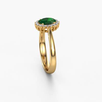 The ring shown above is called the Tilly ovl 1. We call this type of ring a cluster ring, the centre gemstone is surrounded by smaller sized stones. This 14 Carat gold version is set with a 7x5 mm oval emerald centre stone, embraced by smaller lab-grown diamonds. The classic gold cluster engagement ring stands out because of its shape. Together, the smaller and bigger sized emerald gemstones form a flower and they appear to collide into one big sparkling gem. This classic engagement ring is also known as the flower ring. Our expert Goldsmiths make sure the smaller lab-grown diamonds stones are set identically so there is no light interference in the emerald but unity instead. With perfect precision and a skilful hand each emerald is set in the ring. During manufacturing, it is constantly monitored to make sure light reflects flawlessly. This results in a unique engagement ring, with a radiant emerald at its centre. A lovely, meaningful gift to bestow upon the love of your life. By using a combination of the latest modern techniques, combined with ancient crafting, we can make all our engagement rings in our own studio. Each jewel is made to order. This is advantageous because we can offer you a price you won't find anywhere else.Do you have a specific ring in mind? One you came across somewhere. Please feel free to tell us your wishes and we will turn your design into a unique engagement ring. You can follow the development of your ring design because we use 3D drawings. This gives you a realistic preview of your design. We will gladly send you a non-binding offer, based on a fair price/ quality ratio. It will amaze you.To make it easier for you, we offer a 30 day return policy. Check our terms and conditions.