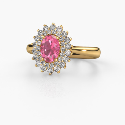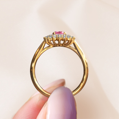 The ring shown above is called the Alina 1. We call this type of ring a cluster ring, the centre gemstone is surrounded by smaller sized stones. This 14 Carat gold version is set with a 7x5 mm oval pink sapphire centre stone, embraced by smaller diamonds. The classic gold cluster engagement ring stands out because of its shape. Together, the smaller and bigger sized pink sapphire gemstones form a flower and they appear to collide into one big sparkling gem. This classic engagement ring is also known as the flower ring. Our expert Goldsmiths make sure the smaller diamonds stones are set identically so there is no light interference in the pink sapphire but unity instead. With perfect precision and a skilful hand each pink sapphire is set in the ring. During manufacturing, it is constantly monitored to make sure light reflects flawlessly. This results in a unique engagement ring, with a radiant pink sapphire at its centre. A lovely, meaningful gift to bestow upon the love of your life. Are you on a budget? Please feel free to contact us, so we can go discuss your options. We offer our engagement rings at guaranteed best price, because we make them to order. You won't find such a price anywhere else!Our designers and goldsmiths work together each day, creating new jewels. Perhaps you have found a nice classic engagement ring somewhere, which can be used to customize your unique ring. Please feel free to contact us. We will make you an offer, based on a fair price/ quality ratio, which will amaze you.To make it easier for you, we offer a 30 day return policy. Check our terms and conditions.
