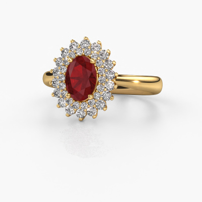 The ring shown above is called the Alina 1. We call this type of ring a cluster ring, the centre gemstone is surrounded by smaller sized stones. This 14 Carat gold version is set with a 7x5 mm oval ruby centre stone, embraced by smaller diamonds. The classic gold cluster engagement ring stands out because of its shape. Together, the smaller and bigger sized ruby gemstones form a flower and they appear to collide into one big sparkling gem. This classic engagement ring is also known as the flower ring. Our expert Goldsmiths make sure the smaller diamonds stones are set identically so there is no light interference in the ruby but unity instead. With perfect precision and a skilful hand each ruby is set in the ring. During manufacturing, it is constantly monitored to make sure light reflects flawlessly. This results in a unique engagement ring, with a radiant ruby at its centre. A lovely, meaningful gift to bestow upon the love of your life. Are you on a budget? Please feel free to contact us, so we can go discuss your options. We offer our engagement rings at guaranteed best price, because we make them to order. You won't find such a price anywhere else!Our designers and goldsmiths work together each day, creating new jewels. Perhaps you have found a nice classic engagement ring somewhere, which can be used to customize your unique ring. Please feel free to contact us. We will make you an offer, based on a fair price/ quality ratio, which will amaze you.To make it easier for you, we offer a 30 day return policy. Check our terms and conditions.