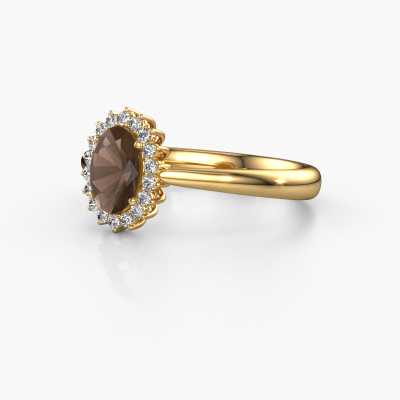 The ring shown above is called the Tilly ovl 1. We call this type of ring a cluster ring, the centre gemstone is surrounded by smaller sized stones. This 14 Carat gold version is set with a 7x5 mm oval smokey quartz centre stone, embraced by smaller lab-grown diamonds. The classic gold cluster engagement ring stands out because of its shape. Together, the smaller and bigger sized smokey quartz gemstones form a flower and they appear to collide into one big sparkling gem. This classic engagement ring is also known as the flower ring. Our expert Goldsmiths make sure the smaller lab-grown diamonds stones are set identically so there is no light interference in the smokey quartz but unity instead. With perfect precision and a skilful hand each smokey quartz is set in the ring. During manufacturing, it is constantly monitored to make sure light reflects flawlessly. This results in a unique engagement ring, with a radiant smokey quartz at its centre. A lovely, meaningful gift to bestow upon the love of your life. By using a combination of the latest modern techniques, combined with ancient crafting, we can make all our engagement rings in our own studio. Each jewel is made to order. This is advantageous because we can offer you a price you won't find anywhere else.Do you have a specific ring in mind? One you came across somewhere. Please feel free to tell us your wishes and we will turn your design into a unique engagement ring. You can follow the development of your ring design because we use 3D drawings. This gives you a realistic preview of your design. We will gladly send you a non-binding offer, based on a fair price/ quality ratio. It will amaze you.To make it easier for you, we offer a 30 day return policy. Check our terms and conditions.