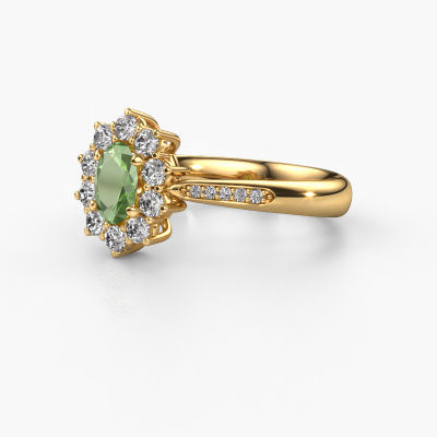 The ring shown above is called the Leesa 2. We call this type of ring a cluster ring, the centre gemstone is surrounded by smaller sized stones. This 14 Carat gold version is set with a 6x4 mm oval tourmaline green centre stone, embraced by smaller diamonds. The classic gold cluster engagement ring stands out because of its shape. Together, the smaller and bigger sized tourmaline green gemstones form a flower and they appear to collide into one big sparkling gem. This classic engagement ring is also known as the flower ring. Our expert Goldsmiths make sure the smaller diamonds stones are set identically so there is no light interference in the tourmaline green but unity instead. With perfect precision and a skilful hand each tourmaline green is set in the ring. During manufacturing, it is constantly monitored to make sure light reflects flawlessly. This results in a unique engagement ring, with a radiant tourmaline green at its centre. A lovely, meaningful gift to bestow upon the love of your life. Are you on a budget? Please feel free to contact us, so we can go discuss your options. We offer our engagement rings at guaranteed best price, because we make them to order. You won't find such a price anywhere else!Our designers and goldsmiths work together each day, creating new jewels. Perhaps you have found a nice classic engagement ring somewhere, which can be used to customize your unique ring. Please feel free to contact us. We will make you an offer, based on a fair price/ quality ratio, which will amaze you.To make it easier for you, we offer a 30 day return policy. Check our terms and conditions.