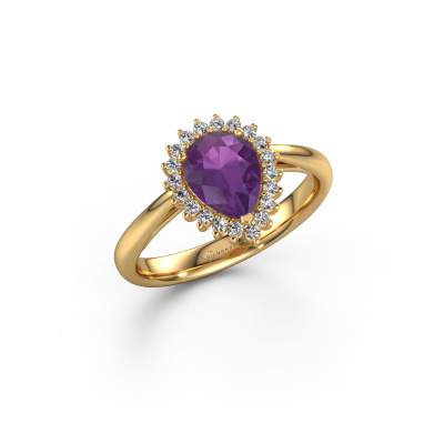 The ring shown above is called the Tilly per 1. We call this type of ring a cluster ring, the centre gemstone is surrounded by smaller sized stones. This 14 Carat gold version is set with a 8x6 mm pear amethyst centre stone, embraced by smaller diamonds. The exclusive gold cluster engagement ring stands out because of its shape. Together, the smaller and bigger sized amethyst gemstones form a flower and they appear to collide into one big sparkling gem. This exclusive engagement ring is also known as the flower ring. Our expert Goldsmiths make sure the smaller diamonds stones are set identically so there is no light interference in the amethyst but unity instead. With perfect precision and a skilful hand each amethyst is set in the ring. During manufacturing, it is constantly monitored to make sure light reflects flawlessly. This results in a unique engagement ring, with a radiant amethyst at its centre. A lovely, meaningful gift to bestow upon the love of your life. After receiving your order, our goldsmiths will start the creative process of making your Tilly per 1 engagement ring. We don't keep stock. This is advantageous because these costs will not be passed on to you. Therefore, we can offer jewellery at exceptionally low prices.Our team adds new designs to our online collection daily. Our designers and goldsmiths work together in creating the best design. We strive to offer a diverse collection of jewels. Perhaps you have a specific jewel design in mind. One you came across somewhere. Please contact us for a free consultation. We will make you an offer, based on a fair price/ quality ratio, that will baffle you.To make it easier for you, we offer a 30 day return policy. Check our terms and conditions.