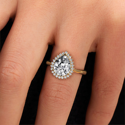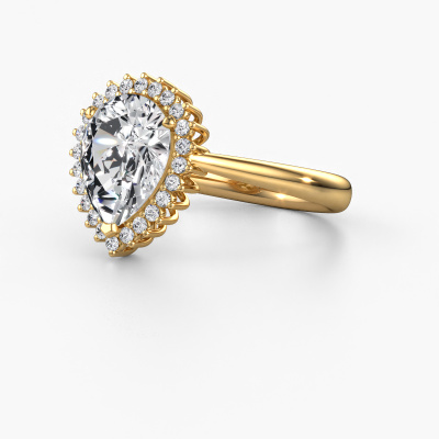 The ring shown above is called the Tilly per 1. We call this type of ring a cluster ring, the centre gemstone is surrounded by smaller sized stones. This 14 Carat gold version is set with a 2.10 crt pear lab grown diamond centre stone, embraced by smaller diamonds. The exclusive gold cluster engagement ring stands out because of its shape. Together, the smaller and bigger sized lab grown diamond gemstones form a flower and they appear to collide into one big sparkling gem. This exclusive engagement ring is also known as the flower ring. Our expert Goldsmiths make sure the smaller diamonds stones are set identically so there is no light interference in the lab grown diamond but unity instead. With perfect precision and a skilful hand each lab grown diamond is set in the ring. During manufacturing, it is constantly monitored to make sure light reflects flawlessly. This results in a unique engagement ring, with a radiant lab grown diamond at its centre. A lovely, meaningful gift to bestow upon the love of your life. After receiving your order, our goldsmiths will start the creative process of making your Tilly per 1 engagement ring. We don't keep stock. This is advantageous because these costs will not be passed on to you. Therefore, we can offer jewellery at exceptionally low prices.Our team adds new designs to our online collection daily. Our designers and goldsmiths work together in creating the best design. We strive to offer a diverse collection of jewels. Perhaps you have a specific jewel design in mind. One you came across somewhere. Please contact us for a free consultation. We will make you an offer, based on a fair price/ quality ratio, that will baffle you.To make it easier for you, we offer a 30 day return policy. Check our terms and conditions.