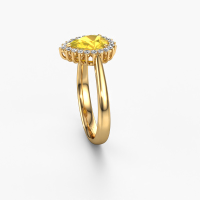 The ring shown above is called the Tilly per 1. We call this type of ring a cluster ring, the centre gemstone is surrounded by smaller sized stones. This 14 Carat gold version is set with a 8x6 mm pear yellow sapphire centre stone, embraced by smaller diamonds. The exclusive gold cluster engagement ring stands out because of its shape. Together, the smaller and bigger sized yellow sapphire gemstones form a flower and they appear to collide into one big sparkling gem. This exclusive engagement ring is also known as the flower ring. Our expert Goldsmiths make sure the smaller diamonds stones are set identically so there is no light interference in the yellow sapphire but unity instead. With perfect precision and a skilful hand each yellow sapphire is set in the ring. During manufacturing, it is constantly monitored to make sure light reflects flawlessly. This results in a unique engagement ring, with a radiant yellow sapphire at its centre. A lovely, meaningful gift to bestow upon the love of your life. After receiving your order, our goldsmiths will start the creative process of making your Tilly per 1 engagement ring. We don't keep stock. This is advantageous because these costs will not be passed on to you. Therefore, we can offer jewellery at exceptionally low prices.Our team adds new designs to our online collection daily. Our designers and goldsmiths work together in creating the best design. We strive to offer a diverse collection of jewels. Perhaps you have a specific jewel design in mind. One you came across somewhere. Please contact us for a free consultation. We will make you an offer, based on a fair price/ quality ratio, that will baffle you.To make it easier for you, we offer a 30 day return policy. Check our terms and conditions.