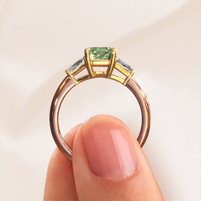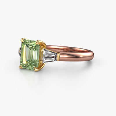 This 14 Carat rose gold ring is called Kina EME and is set with green lab grown diamond. How would you describe the style of the love of your life? Does she have a unique sense of style? This stunning special rose gold engagement ring can be custom-made to your own or her liking. Our green lab grown diamonds gemstones have been carefully selected because we believe your exclusive engagement ring must be adorned with nothing but the most beautiful gemstone. Don't you agree? This jewel is made by a team of passionate goldsmiths and jewel designers. This will make your crown jewel truly eye-catching.Are you on a budget? Please feel free to contact us, so we can go discuss your options. We offer our engagement rings at guaranteed best price, because we make them to order. You won't find such a price anywhere else!Have you found a specific engagement ring somewhere which you would like to give to your loved one? Please feel free to express your wishes to our jewel designers because we would be honoured to turn your design into a exclusive engagement ring. You can follow the development of your ring design because we use 3D drawings. This gives you a realistic preview of how your design will look. You can also preorder a dummy. A dummy is a plastic ring, which can be shaped according your ring design. You can try it on and check if its width and size are suitable for you. We will gladly send you a non-binding offer, based on a fair price/ quality ratio. It will amaze you, considering the quality of the ring and gemstones.To make it easier for you, we offer a 30 day return policy. Check our terms and conditions.
