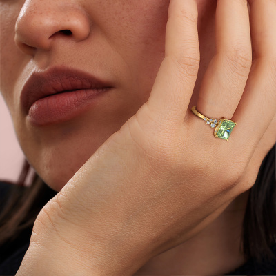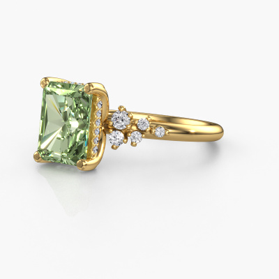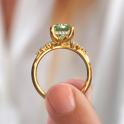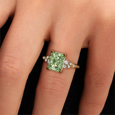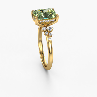 This 14 Carat gold ring is called Emma RAD and is set with 9x7 mm green lab grown diamond. What is it that makes your relationship unique? What is it about her that makes you want to bend down on one knee? The unique bond between the two of you is emphasized by an equally unique ring. A one of a kind stylish pavé solitaire engagement ring made especially for her. That is why this exclusive ring fits her like a glove. Each specific detail of this stylish gold green lab grown diamond set engagement ring is hand-picked, crafted and polished by our expert goldsmith. The result is an exquisite ring, unique and perfectly crafted to perfection. That is what our expert Goldsmiths strive for. This jewel is made by a team of passionate goldsmiths and jewel designers. This will make your crown jewel truly eye-catching.Because we design and deliver our own rings, we can offer you a engagement ring at a price you won't find anywhere else. A ring is made to order, which helps prevent excess supplies, so we can make you a great price offer. We understand it feels risky, buying your engagement ring online, but we will gladly assist in the designing process, taking your budget into consideration.Our designers and goldsmiths work together each day, creating new jewels. Perhaps you have found a nice exclusive engagement ring somewhere, which can be used to customize your unique ring. Please feel free to contact us. We will make you an offer, based on a fair price/ quality ratio, which will amaze you.To make it easier for you, we offer a 30 day return policy. Check our terms and conditions.