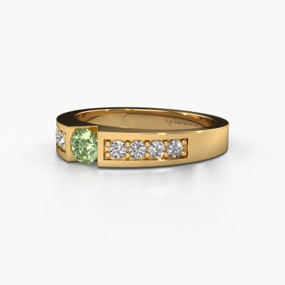 The ring shown above is called the Lizzy 2. We call this type of ring a pavé solitaire ring because it has one centre gemstone and a band that is also pave set with gemstones. This engagement ring is made in 14 Carat gold set with a 4.2 mm round green lab grown diamond, and pave set diamonds at the sides. Each piece of jewellery is made to shine bright around your finger. Each jewel is hand made with love by our goldsmiths.This modern gold pavé solitaire engagement ring has an exquisite round green lab grown diamond centre stone. To further accentuate the centre stone, the band is set full with more diamonds. Its open prong setting allows light to strike the green lab grown diamond from various angles and this adds sparkle to your green lab grown diamond ring. The photo shown above depicts the goldsmith's carefully handcrafted details of the ring. The high positioning of the centre stone is truly eye-catching. The perfect engagement ring for the crown jewel of your life!