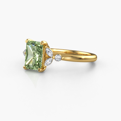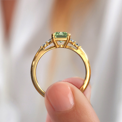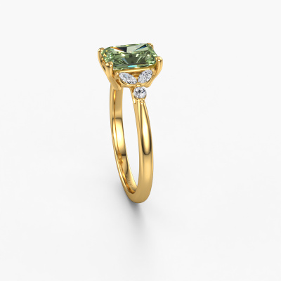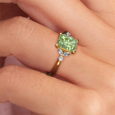 The ring shown above is called the Megan RAD. We call this type of ring a pavé solitaire ring because it has one centre gemstone and a band that is also pave set with gemstones. This engagement ring is made in 14 Carat gold set with a 7.5x5.5 mm radiant green lab grown diamond, and pave set lab-grown diamonds at the sides. Each piece of jewellery is made with passion and love by one of our master goldsmiths.This traditional gold pavé solitaire engagement ring has an exquisite radiant green lab grown diamond centre stone. To further accentuate the centre stone, the band is set full with more lab-grown diamonds. Its open prong setting allows light to strike the green lab grown diamond from various angles and this adds sparkle to your green lab grown diamond ring. The photo shown above depicts the goldsmith's carefully handcrafted details of the ring. The high positioning of the centre stone is truly eye-catching. The perfect engagement ring for the crown jewel of your life!By using our modern techniques, we can design and customize the finest quality jewels with the utmost care for you. Our engagement rings are always priced 30 percent lower than other jewellers. We make engagement rings to order so we don't have to maintain a large stock. If you have a certain budget, we are more than happy to advice you accordingly.Our team adds new designs to our online collection daily. Our designers and goldsmiths work together in creating the best design. We strive to offer a diverse collection of jewels. Perhaps you have a specific jewel design in mind. One you came across somewhere. Please contact us for a free consultation. We will make you an offer, based on a fair price/ quality ratio, that will baffle you.To make it easier for you, we offer a 30 day return policy. Check our terms and conditions.
