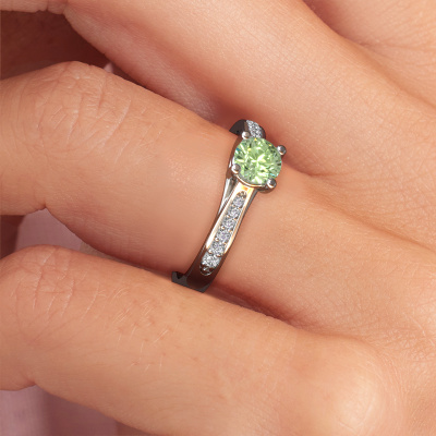 The ring shown above is called the Mia 2. We call this type of ring a pavé solitaire ring because it has one centre gemstone and a band that is also pave set with gemstones. This engagement ring is made in platinum set with a 5 mm round green lab grown diamond, and pave set lab-grown diamonds at the sides. Each piece of jewellery is made just for you, with attention to detail and design.This modern platinum pavé solitaire engagement ring has an exquisite round green lab grown diamond centre stone. To further accentuate the centre stone, the band is set full with more lab-grown diamonds. Its open prong setting allows light to strike the green lab grown diamond from various angles and this adds sparkle to your green lab grown diamond ring. The photo shown above depicts the goldsmith's carefully handcrafted details of the ring. The high positioning of the centre stone is truly eye-catching. The perfect engagement ring for the crown jewel of your life!By using our modern techniques, we can design and customize the finest quality jewels with the utmost care for you. Our engagement rings are always priced 30 percent lower than other jewellers. We make engagement rings to order so we don't have to maintain a large stock. If you have a certain budget, we are more than happy to advice you accordingly.Different styles of new rings are made daily by our team. Perhaps you have found a pavé solitaire engagement ring somewhere. One you would like to give to your loved one. Please feel free to share your thoughts and design with our jewel designers. We would love to turn your design into a modern engagement ring. You can follow the development of your ring design because we use very detailed 3D drawings. On top of that, you can order a dummy of the design. A dummy is a plastic ring, which can be shaped according your ring design. You can try it on and check if the engagement ring is up to standard. We will gladly send you a non-binding offer, based on a fair price/ quality ratio. The offer will baffle you, considering the quality of the ring and gemstones.To make it easier for you, we offer a 30 day return policy. Check our terms and conditions.