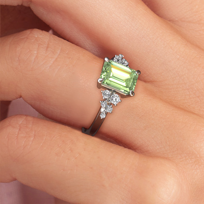 This platinum ring is called Royce EME and is set with 8x6 mm green lab grown diamond. What is it that makes your relationship unique? What is it about her that makes you want to bend down on one knee? The unique bond between the two of you is