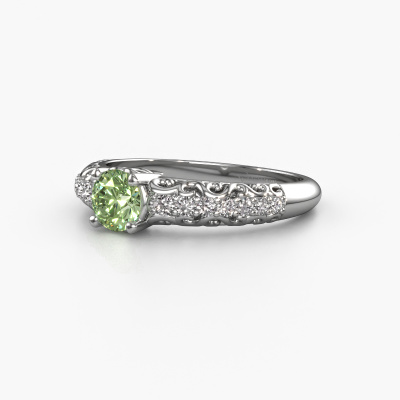 This platinum ring is called Mellie and is set with 5 mm green lab grown diamond. What is it that makes your relationship unique? What is it about her that makes you want to bend down on one knee? The unique bond between the two of you is emphasized by an equally unique ring. A one of a kind filigree pavé solitaire engagement ring made especially for her. That is why this vintage ring fits her like a glove. Each specific detail of this filigree platinum green lab grown diamond set engagement ring is hand-picked, crafted and polished by our expert goldsmith. The result is an exquisite ring, unique and perfectly crafted to perfection. That is what our expert Goldsmiths strive for. This jewel is made by a team of passionate goldsmiths and jewel designers. This will make your crown jewel truly eye-catching.Are you on a budget? Please feel free to contact us, so we can go discuss your options. We offer our engagement rings at guaranteed best price, because we make them to order. You won't find such a price anywhere else!Have you found a specific engagement ring somewhere which you would like to give to your loved one? Please feel free to express your wishes to our jewel designers because we would be honoured to turn your design into a vintage engagement ring. You can follow the development of your ring design because we use 3D drawings. This gives you a realistic preview of how your design will look. You can also preorder a dummy. A dummy is a plastic ring, which can be shaped according your ring design. You can try it on and check if its width and size are suitable for you. We will gladly send you a non-binding offer, based on a fair price/ quality ratio. It will amaze you, considering the quality of the ring and gemstones.To make it easier for you, we offer a 30 day return policy. Check our terms and conditions.