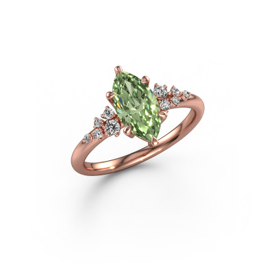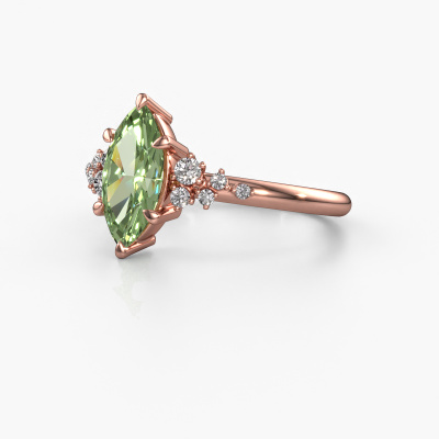 The ring shown above is called the Royce MRQ. We call this type of ring a pavé solitaire ring because it has one centre gemstone and a band that is also pave set with gemstones. This engagement ring is made in 14 Carat rose gold set with a 11x5.5