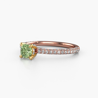The ring shown above is called the Saskia 2 cus. We call this type of ring a pavé solitaire ring because it has one centre gemstone and a band that is also pave set with gemstones. The 14 Carat rose gold engagement ring is set with a cushion 4.5 mm green lab grown diamond centre stone and the band is pave set with lab grown diamond gemstones. Each jewel is made just for you, with attention to detail and design.This contemporary rose gold pavé solitaire engagement ring has an exquisite cushion green lab grown diamond centre stone. To further accentuate the centre stone, the band is fully set with more lab-grown diamonds. Its open prong setting allows light to strike the green lab grown diamond from various angles and this adds sparkle to your green lab grown diamond ring. The photo shown above depicts the goldsmith's carefully handcrafted details of the ring. The high positioning of the centre stone is truly eye-catching. The perfect engagement ring for the crown jewel of your life! Are you on a budget? Please feel free to contact us, so we can go discuss your options. We offer our engagement rings at guaranteed best price, because we make them to order. You won't find such a price anywhere else!Our designers and goldsmiths work together each day, creating new jewels. Perhaps you have found a nice contemporary engagement ring somewhere, which can be used to customize your unique ring. Please feel free to contact us. We will make you an offer, based on a fair price/ quality ratio, which will amaze you.To make it easier for you, we offer a 30 day return policy. Check our terms and conditions.