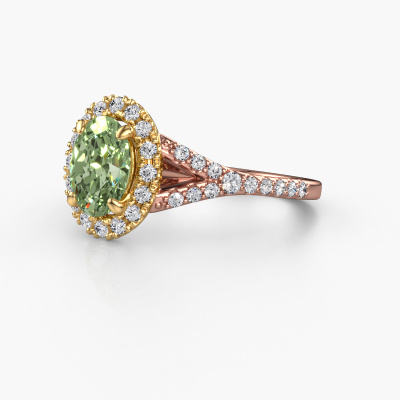The ring shown above is called the Kimber OVL. We call this type of ring a pavé solitaire ring because it has one centre gemstone and a band that is also pave set with gemstones. The 14 Carat rose gold engagement ring is set with a oval 8x6 mm green lab grown diamond centre stone and the band is pave set with lab grown diamond gemstones. Each jewel is made with passion and love by one of our master goldsmiths.This exclusive rose gold pavé solitaire engagement ring has an exquisite oval green lab grown diamond centre stone. To further accentuate the centre stone, the band is fully set with more lab-grown diamonds. Its open prong setting allows light to strike the green lab grown diamond from various angles and this adds sparkle to your green lab grown diamond ring. The photo shown above depicts the goldsmith's carefully handcrafted details of the ring. The high positioning of the centre stone is truly eye-catching. The perfect engagement ring for the crown jewel of your life! By using a combination of the latest modern techniques, combined with ancient crafting, we can make all our engagement rings in our own studio. Each jewel is made to order. This is advantageous because we can offer you a price you won't find anywhere else.Our team adds new designs to our online collection daily. Our designers and goldsmiths work together in creating the best design. We strive to offer a diverse collection of jewels. Perhaps you have a specific jewel design in mind. One you came across somewhere. Please contact us for a free consultation. We will make you an offer, based on a fair price/ quality ratio, that will baffle you.To make it easier for you, we offer a 30 day return policy. Check our terms and conditions.