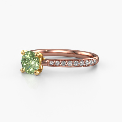 The ring shown above is called the Mignon rnd 2. We call this type of ring a pavé solitaire ring because it has one centre gemstone and a band that is also pave set with gemstones. The 14 Carat rose gold engagement ring is set with a round 6 mm green lab grown diamond centre stone and the band is pave set with lab grown diamond gemstones. Each jewel is made by a team of passionate goldsmiths and jewel designers. This will make your crown jewel truly eye-catching.This luxury rose gold pavé solitaire engagement ring has an exquisite round green lab grown diamond centre stone. To further accentuate the centre stone, the band is fully set with more lab-grown diamonds. Its open prong setting allows light to strike the green lab grown diamond from various angles and this adds sparkle to your green lab grown diamond ring. The photo shown above depicts the goldsmith's carefully handcrafted details of the ring. The high positioning of the centre stone is truly eye-catching. The perfect engagement ring for the crown jewel of your life! By using our modern techniques, we can design and customize the finest quality jewels with the utmost care for you. Our engagement rings are always priced 30 percent lower than other jewellers. We make engagement rings to order so we don't have to maintain a large stock. If you have a certain budget, we are more than happy to advice you accordingly.Different styles of new rings are made daily by our team. Perhaps you have found a pavé solitaire engagement ring somewhere. One you would like to give to your loved one. Please feel free to share your thoughts and design with our jewel designers. We would love to turn your design into a luxury engagement ring. You can follow the development of your ring design because we use very detailed 3D drawings. On top of that, you can order a dummy of the design. A dummy is a plastic ring, which can be shaped according your ring design. You can try it on and check if the engagement ring is up to standard. We will gladly send you a non-binding offer, based on a fair price/ quality ratio. The offer will baffle you, considering the quality of the ring and gemstones.To make it easier for you, we offer a 30 day return policy. Check our terms and conditions.
