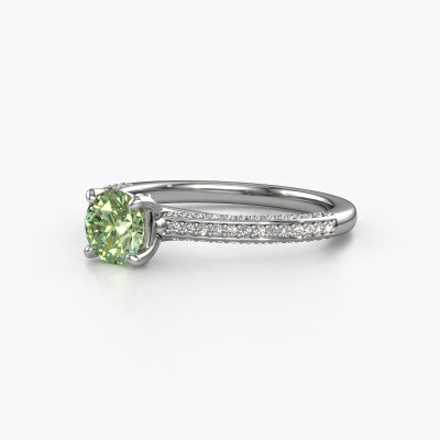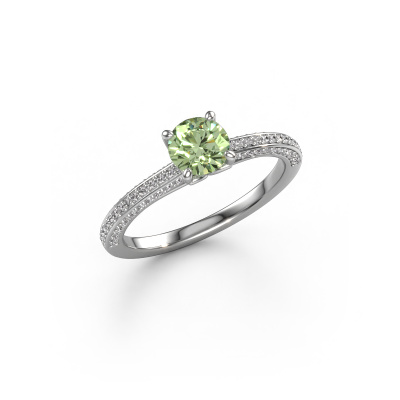 The ring shown above is called the Elenore rnd. We call this type of ring a pavé solitaire ring because it has one centre gemstone and a band that is also pave set with gemstones. This engagement ring is made in 14 Carat white gold set with a 5.4 mm round green lab grown diamond, and pave set lab-grown diamonds at the sides. Each piece of jewellery is made just for you by our master goldsmiths in our own studio.This exclusive white gold pavé solitaire engagement ring has an exquisite round green lab grown diamond centre stone. To further accentuate the centre stone, the band is set full with more lab-grown diamonds. Its open prong setting allows light to strike the green lab grown diamond from various angles and this adds sparkle to your green lab grown diamond ring. The photo shown above depicts the goldsmith's carefully handcrafted details of the ring. The high positioning of the centre stone is truly eye-catching. The perfect engagement ring for the crown jewel of your life!By using a combination of the latest modern techniques, combined with ancient crafting, we can make all our engagement rings in our own studio. Each jewel is made to order. This is advantageous because we can offer you a price you won't find anywhere else.Have you found a specific engagement ring somewhere which you would like to give to your loved one? Please feel free to express your wishes to our jewel designers because we would be honoured to turn your design into a exclusive engagement ring. You can follow the development of your ring design because we use 3D drawings. This gives you a realistic preview of how your design will look. You can also preorder a dummy. A dummy is a plastic ring, which can be shaped according your ring design. You can try it on and check if its width and size are suitable for you. We will gladly send you a non-binding offer, based on a fair price/ quality ratio. It will amaze you, considering the quality of the ring and gemstones.To make it easier for you, we offer a 30 day return policy. Check our terms and conditions.
