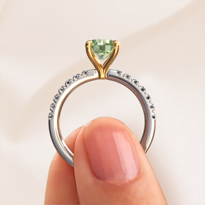 The ring shown above is called the Crystal RND 2. We call this type of ring a pavé solitaire ring because it has one centre gemstone and a band that is also pave set with gemstones. The 14 Carat white gold engagement ring is set with a round 7 mm green lab grown diamond centre stone and the band is pave set with lab grown diamond gemstones. Each jewel is unique in every way! Simply customize to your liking,This classic white gold pavé solitaire engagement ring has an exquisite round green lab grown diamond centre stone. To further accentuate the centre stone, the band is fully set with more lab-grown diamonds. Its open prong setting allows light to strike the green lab grown diamond from various angles and this adds sparkle to your green lab grown diamond ring. The photo shown above depicts the goldsmith's carefully handcrafted details of the ring. The high positioning of the centre stone is truly eye-catching. The perfect engagement ring for the crown jewel of your life! After receiving your order, our goldsmiths will start the creative process of making your Crystal RND 2 engagement ring. We don't keep stock. This is advantageous because these costs will not be passed on to you. Therefore, we can offer jewellery at exceptionally low prices.Different styles of new rings are made daily by our team. Perhaps you have found a pavé solitaire engagement ring somewhere. One you would like to give to your loved one. Please feel free to share your thoughts and design with our jewel designers. We would love to turn your design into a classic engagement ring. You can follow the development of your ring design because we use very detailed 3D drawings. On top of that, you can order a dummy of the design. A dummy is a plastic ring, which can be shaped according your ring design. You can try it on and check if the engagement ring is up to standard. We will gladly send you a non-binding offer, based on a fair price/ quality ratio. The offer will baffle you, considering the quality of the ring and gemstones.To make it easier for you, we offer a 30 day return policy. Check our terms and conditions.