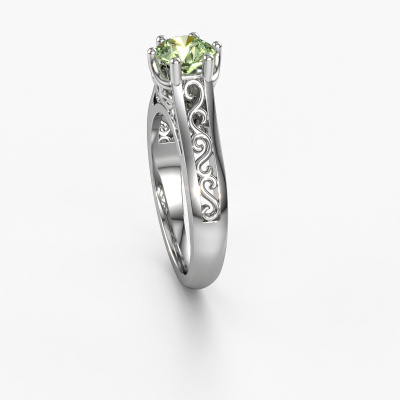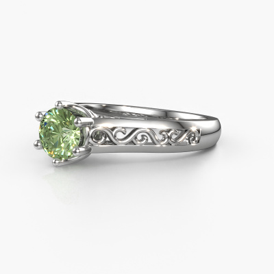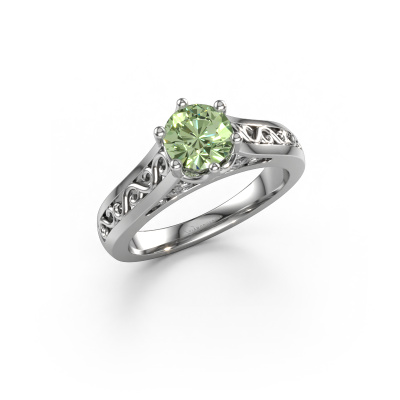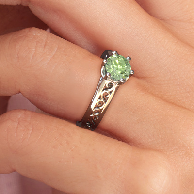The ring shown above is called the Shan, we call this a solitaire ring because it contains a single gemstone. The engagement ring is made in platinum and has a round green lab grown diamond of 6 mm. The cool thing about our configurator is that you can compile your own piece of jewellery, into a completely personalized one. This solitaire ring is crafted in the precious metals platinum with platinum, but of course you are free to pick your own colours. Each piece of jewellery is made by a team of passionate goldsmiths and jewel designers. This will make your crown jewel truly eye-catching.The solitaire ring is a special type of engagement ring. Its open prong setting allows light to strike the gemstone from various angles. This Celtic engagement ring is a stunning eye-catcher because of the high positioning of the gemstone. In order for you to commemorate your proposal with a unique ring, we carefully adorn this solitaire ring by hand. The love of your life deserves nothing but the best. By using our modern techniques, we can design and customize the finest quality jewels with the utmost care for you. Our engagement rings are always priced 30 percent lower than other jewellers. We make engagement rings to order so we don't have to maintain a large stock. If you have a certain budget, we are more than happy to advice you accordingly.Have you found a specific engagement ring somewhere which you would like to give to your loved one? Please feel free to express your wishes to our jewel designers because we would be honoured to turn your design into a Celtic engagement ring. You can follow the development of your ring design because we use 3D drawings. This gives you a realistic preview of how your design will look. You can also preorder a dummy. A dummy is a plastic ring, which can be shaped according your ring design. You can try it on and check if its width and size are suitable for you. We will gladly send you a non-binding offer, based on a fair price/ quality ratio. It will amaze you, considering the quality of the ring and gemstones.To make it easier for you, we offer a 30 day return policy. Check our terms and conditions.