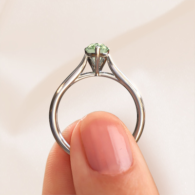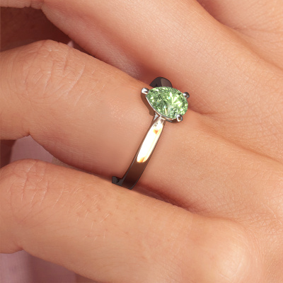 The ring shown above is called the Mignon PER 1, we call this a solitaire ring because it contains a single gemstone. The engagement ring is made in platinum and has a pear green lab grown diamond of 7x5 mm. The cool thing about our configurator is that you can compile your own piece of jewellery, into a completely personalized one. This solitaire ring is crafted in the precious metals platinum with platinum, but of course you are free to pick your own colours. Each piece of jewellery is created to add sparkle to your finger, each jewel is lovingly made by hand by our goldsmiths.The solitaire ring is a special type of engagement ring. Its open prong setting allows light to strike the gemstone from various angles. This classic engagement ring is a stunning eye-catcher because of the high positioning of the gemstone. In order for you to commemorate your proposal with a unique ring, we carefully adorn this solitaire ring by hand. The love of your life deserves nothing but the best. After receiving your order, our goldsmiths will start the creative process of making your Mignon PER 1 engagement ring. We don't keep stock. This is advantageous because these costs will not be passed on to you. Therefore, we can offer jewellery at exceptionally low prices.Our team adds new designs to our online collection daily. Our designers and goldsmiths work together in creating the best design. We strive to offer a diverse collection of jewels. Perhaps you have a specific jewel design in mind. One you came across somewhere. Please contact us for a free consultation. We will make you an offer, based on a fair price/ quality ratio, that will baffle you.To make it easier for you, we offer a 30 day return policy. Check our terms and conditions.