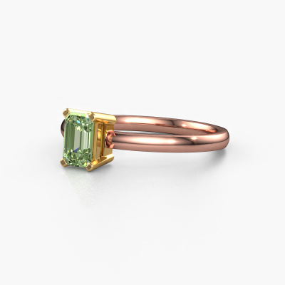 The ring shown above is called the Denita 1 EME, we call this a solitaire ring because it contains a single gemstone. The engagement ring is made in 14 Carat rose gold and has a emerald cut green lab grown diamond of 6x4 mm. The cool thing about our configurator is that you can compile your own piece of jewellery, into a completely personalized one. This solitaire ring is crafted in the precious metals rose gold with gold, but of course you are free to pick your own colours. Each piece of jewellery is made by a team of passionate goldsmiths and jewel designers. This will make your crown jewel truly eye-catching.The solitaire ring is a special type of engagement ring. Its open prong setting allows light to strike the gemstone from various angles. This contemporary engagement ring is a stunning eye-catcher because of the high positioning of the gemstone. In order for you to commemorate your proposal with a unique ring, we carefully adorn this solitaire ring by hand. The love of your life deserves nothing but the best. By using a combination of the latest modern techniques, combined with ancient crafting, we can make all our engagement rings in our own studio. Each jewel is made to order. This is advantageous because we can offer you a price you won't find anywhere else.Our team adds new designs to our online collection daily. Our designers and goldsmiths work together in creating the best design. We strive to offer a diverse collection of jewels. Perhaps you have a specific jewel design in mind. One you came across somewhere. Please contact us for a free consultation. We will make you an offer, based on a fair price/ quality ratio, that will baffle you.To make it easier for you, we offer a 30 day return policy. Check our terms and conditions.