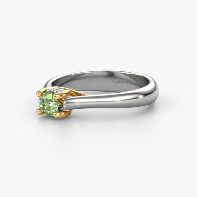 The ring shown above is called the Nisa, we call this a solitaire ring because it contains a single gemstone. The engagement ring is made in 14 Carat white gold and has a round green lab grown diamond of 4.2 mm. The cool thing about our configurator is that you can compile your own piece of jewellery, into a completely personalized one. This solitaire ring is crafted in the precious metals white gold with gold, but of course you are free to pick your own colours. Each piece of jewellery is made by a team of passionate goldsmiths and jewel designers. This will make your crown jewel truly eye-catching.The solitaire ring is a special type of engagement ring. Its open prong setting allows light to strike the gemstone from various angles. This unique engagement ring is a stunning eye-catcher because of the high positioning of the gemstone. In order for you to commemorate your proposal with a unique ring, we carefully adorn this solitaire ring by hand. The love of your life deserves nothing but the best.