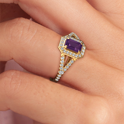 This 14 Carat gold ring is called Pamela EME and is set with 6x4 mm amethyst. This exclusive gold halo engagement ring is a true work of art! The ornaments are crafted with a lot of patience and great passion. In order to create this ring with great precision, this craft requires a keen eye and skilful hand. A challenge which ignites a fire in our expert goldsmith. The exquisite amethysten are set in a special way so they stand out even more. This gives the ring an even more glamorous appearance. The split band engagement ring is actually unique on its own because of the gemstones which we carefully select especially for this ring. On top of that you select the precious metals which will be used to create a unique ring for the most extraordinary woman in your life! This jewel is made just for you, with attention to detail and design.Because we design and deliver our own rings, we can offer you a engagement ring at a price you won't find anywhere else. A ring is made to order, which helps prevent excess supplies, so we can make you a great price offer. We understand it feels risky, buying your engagement ring online, but we will gladly assist in the designing process, taking your budget into consideration.Our team adds new designs to our online collection daily. Our designers and goldsmiths work together in creating the best design. We strive to offer a diverse collection of jewels. Perhaps you have a specific jewel design in mind. One you came across somewhere. Please contact us for a free consultation. We will make you an offer, based on a fair price/ quality ratio, that will baffle you.To make it easier for you, we offer a 30 day return policy. Check our terms and conditions.