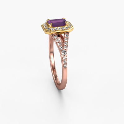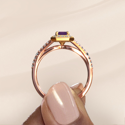 This 14 Carat rose gold ring is called Pamela EME and is set with 6x4 mm amethyst. This exclusive rose gold halo engagement ring is a true work of art! The ornaments are crafted with a lot of patience and great passion. In order to create this ring with great precision, this craft requires a keen eye and skilful hand. A challenge which ignites a fire in our expert goldsmith. The exquisite amethysten are set in a special way so they stand out even more. This gives the ring an even more glamorous appearance. The split band engagement ring is actually unique on its own because of the gemstones which we carefully select especially for this ring. On top of that you select the precious metals which will be used to create a unique ring for the most extraordinary woman in your life! This jewel is made just for you, with attention to detail and design.Because we design and deliver our own rings, we can offer you a engagement ring at a price you won't find anywhere else. A ring is made to order, which helps prevent excess supplies, so we can make you a great price offer. We understand it feels risky, buying your engagement ring online, but we will gladly assist in the designing process, taking your budget into consideration.Our team adds new designs to our online collection daily. Our designers and goldsmiths work together in creating the best design. We strive to offer a diverse collection of jewels. Perhaps you have a specific jewel design in mind. One you came across somewhere. Please contact us for a free consultation. We will make you an offer, based on a fair price/ quality ratio, that will baffle you.To make it easier for you, we offer a 30 day return policy. Check our terms and conditions.