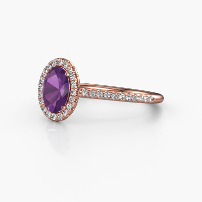 The ring shown above is called the Seline ovl 2. We call this type of ring a halo ring because it has one centre gemstone and a band that is also pave set with gemstones. The 14 Carat rose gold engagement ring is set with a oval 7x5 mm amethyst centre stone and the band is pave set with diamonds. What makes this exclusive rose gold halo ring special are the smaller sized stones embracing the centre stone. This gorgeous engagement ring is called a halo ring because the smaller gemstones give the centre stone a halo of surrounding light. In order for the smaller stones to enhance the centre stone, they have to be placed so there is no interference of light. And that's when our expert goldsmiths come in. Each individual stone is carefully set in the ring by hand. During manufacturing, light fall is constantly monitored to make sure the special halo is still visible. In the end you get a unique engagement ring, with a amethyst of your choosing at its centre. You can imagine the effect of a ring of such significance when you give it to her on her special day to shine. After receiving your order, our goldsmiths will start the creative process of making your Seline ovl 2 engagement ring. We don't keep stock. This is advantageous because these costs will not be passed on to you. Therefore, we can offer jewellery at exceptionally low prices.Our team adds new designs to our online collection daily. Our designers and goldsmiths work together in creating the best design. We strive to offer a diverse collection of jewels. Perhaps you have a specific jewel design in mind. One you came across somewhere. Please contact us for a free consultation. We will make you an offer, based on a fair price/ quality ratio, that will baffle you.To make it easier for you, we offer a 30 day return policy. Check our terms and conditions.