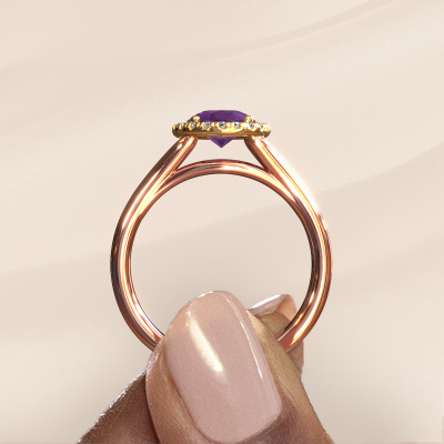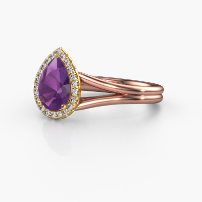 This 14 Carat rose gold ring is called Verla pear 1 and is set with 8x6 mm amethyst. This exclusive rose gold halo engagement ring is a true work of art! The ornaments are crafted with a lot of patience and great passion. In order to create this ring with great precision, this craft requires a keen eye and skilful hand. A challenge which ignites a fire in our expert goldsmith. The exquisite amethysten are set in a special way so they stand out even more. This gives the ring an even more glamorous appearance. The graceful engagement ring is actually unique on its own because of the gemstones which we carefully select especially for this ring. On top of that you select the precious metals which will be used to create a unique ring for the most extraordinary woman in your life! This jewel is made to shine bright around your finger. Each jewel is hand made with love by our goldsmiths.By using a combination of the latest modern techniques, combined with ancient crafting, we can make all our engagement rings in our own studio. Each jewel is made to order. This is advantageous because we can offer you a price you won't find anywhere else.Have you found a specific engagement ring somewhere which you would like to give to your loved one? Please feel free to express your wishes to our jewel designers because we would be honoured to turn your design into a luxury engagement ring. You can follow the development of your ring design because we use 3D drawings. This gives you a realistic preview of how your design will look. You can also preorder a dummy. A dummy is a plastic ring, which can be shaped according your ring design. You can try it on and check if its width and size are suitable for you. We will gladly send you a non-binding offer, based on a fair price/ quality ratio. It will amaze you, considering the quality of the ring and gemstones.To make it easier for you, we offer a 30 day return policy. Check our terms and conditions.