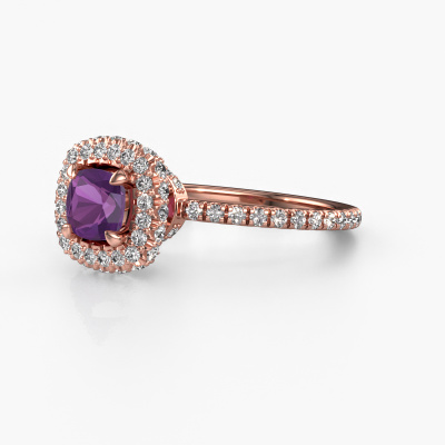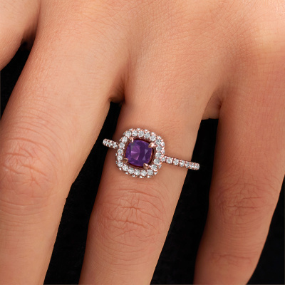 The ring shown above is called the Talitha CUS. We call this type of ring a halo ring because it has one centre gemstone and a band that is also pave set with gemstones. The 14 Carat rose gold engagement ring is set with a cushion 5 mm amethyst centre stone and the band is pave set with diamonds. What makes this traditional rose gold halo ring special are the smaller sized stones embracing the centre stone. This gorgeous engagement ring is called a halo ring because the smaller gemstones give the centre stone a halo of surrounding light. In order for the smaller stones to enhance the centre stone, they have to be placed so there is no interference of light. And that's when our expert goldsmiths come in. Each individual stone is carefully set in the ring by hand. During manufacturing, light fall is constantly monitored to make sure the special halo is still visible. In the end you get a unique engagement ring, with a amethyst of your choosing at its centre. You can imagine the effect of a ring of such significance when you give it to her on her special day to shine. Because we design and deliver our own rings, we can offer you a engagement ring at a price you won't find anywhere else. A ring is made to order, which helps prevent excess supplies, so we can make you a great price offer. We understand it feels risky, buying your engagement ring online, but we will gladly assist in the designing process, taking your budget into consideration.Our designers and goldsmiths work together each day, creating new jewels. Perhaps you have found a nice traditional engagement ring somewhere, which can be used to customize your unique ring. Please feel free to contact us. We will make you an offer, based on a fair price/ quality ratio, which will amaze you.To make it easier for you, we offer a 30 day return policy. Check our terms and conditions.