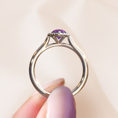 This 14 Carat white gold ring is called Seline per 1 and is set with 7x5 mm amethyst. This exclusive white gold halo engagement ring is a true work of art! The ornaments are crafted with a lot of patience and great passion. In order to create this ring with great precision, this craft requires a keen eye and skilful hand. A challenge which ignites a fire in our expert goldsmith. The exquisite amethysten are set in a special way so they stand out even more. This gives the ring an even more glamorous appearance. The charming engagement ring is actually unique on its own because of the gemstones which we carefully select especially for this ring. On top of that you select the precious metals which will be used to create a unique ring for the most extraordinary woman in your life! This jewel is made with passion and love by one of our master goldsmiths.After receiving your order, our goldsmiths will start the creative process of making your Seline per 1 engagement ring. We don't keep stock. This is advantageous because these costs will not be passed on to you. Therefore, we can offer jewellery at exceptionally low prices.Our team adds new designs to our online collection daily. Our designers and goldsmiths work together in creating the best design. We strive to offer a diverse collection of jewels. Perhaps you have a specific jewel design in mind. One you came across somewhere. Please contact us for a free consultation. We will make you an offer, based on a fair price/ quality ratio, that will baffle you.To make it easier for you, we offer a 30 day return policy. Check our terms and conditions.