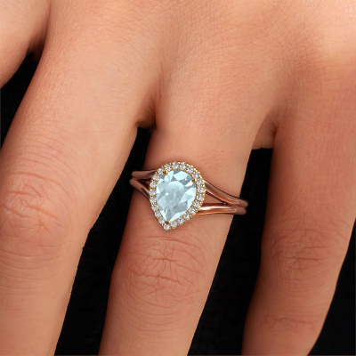 This 14 Carat rose gold ring is called Verla pear 1 and is set with 8x6 mm aquamarine. This exclusive rose gold halo engagement ring is a true work of art! The ornaments are crafted with a lot of patience and great passion. In order to create this ring with great precision, this craft requires a keen eye and skilful hand. A challenge which ignites a fire in our expert goldsmith. The exquisite aquamarine are set in a special way so they stand out even more. This gives the ring an even more glamorous appearance. The graceful engagement ring is actually unique on its own because of the gemstones which we carefully select especially for this ring. On top of that you select the precious metals which will be used to create a unique ring for the most extraordinary woman in your life! This jewel is made to shine bright around your finger. Each jewel is hand made with love by our goldsmiths.By using a combination of the latest modern techniques, combined with ancient crafting, we can make all our engagement rings in our own studio. Each jewel is made to order. This is advantageous because we can offer you a price you won't find anywhere else.Have you found a specific engagement ring somewhere which you would like to give to your loved one? Please feel free to express your wishes to our jewel designers because we would be honoured to turn your design into a luxury engagement ring. You can follow the development of your ring design because we use 3D drawings. This gives you a realistic preview of how your design will look. You can also preorder a dummy. A dummy is a plastic ring, which can be shaped according your ring design. You can try it on and check if its width and size are suitable for you. We will gladly send you a non-binding offer, based on a fair price/ quality ratio. It will amaze you, considering the quality of the ring and gemstones.To make it easier for you, we offer a 30 day return policy. Check our terms and conditions.