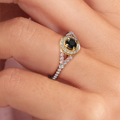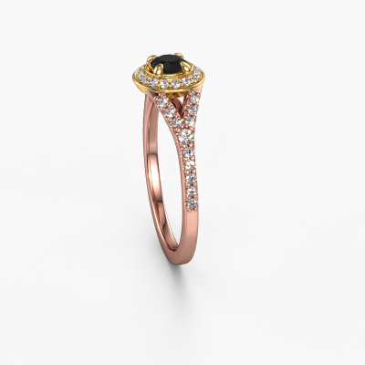 This 14 Carat rose gold ring is called Pamela RND and is set with 0.567 crt black diamond. This exclusive rose gold halo engagement ring is a true work of art! The ornaments are crafted with a lot of patience and great passion. In order to create this ring with great precision, this craft requires a keen eye and skilful hand. A challenge which ignites a fire in our expert goldsmith. The exquisite black diamonds are set in a special way so they stand out even more. This gives the ring an even more glamorous appearance. The ajour engagement ring is actually unique on its own because of the gemstones which we carefully select especially for this ring. On top of that you select the precious metals which will be used to create a unique ring for the most extraordinary woman in your life! This jewel is unique in every way! Simply customize to your liking,Because we design and deliver our own rings, we can offer you a engagement ring at a price you won't find anywhere else. A ring is made to order, which helps prevent excess supplies, so we can make you a great price offer. We understand it feels risky, buying your engagement ring online, but we will gladly assist in the designing process, taking your budget into consideration.Our team adds new designs to our online collection daily. Our designers and goldsmiths work together in creating the best design. We strive to offer a diverse collection of jewels. Perhaps you have a specific jewel design in mind. One you came across somewhere. Please contact us for a free consultation. We will make you an offer, based on a fair price/ quality ratio, that will baffle you.To make it easier for you, we offer a 30 day return policy. Check our terms and conditions.