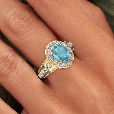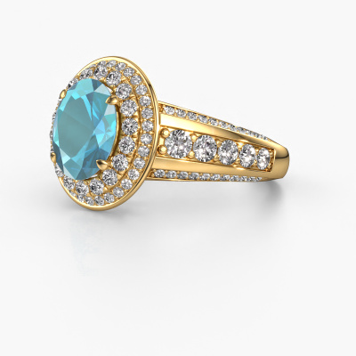 This 14 Carat gold ring is called Nancie and is set with 9x7 mm blue topaz. This exclusive gold halo engagement ring is a true work of art! The ornaments are crafted with a lot of patience and great passion. In order to create this ring with great precision, this craft requires a keen eye and skilful hand. A challenge which ignites a fire in our expert goldsmith. The exquisite blue topaz are set in a special way so they stand out even more. This gives the ring an even more glamorous appearance. The graceful engagement ring is actually unique on its own because of the gemstones which we carefully select especially for this ring. On top of that you select the precious metals which will be used to create a unique ring for the most extraordinary woman in your life! This jewel is created to add sparkle to your finger, each jewel is lovingly made by hand by our goldsmiths.Are you on a budget? Please feel free to contact us, so we can go discuss your options. We offer our engagement rings at guaranteed best price, because we make them to order. You won't find such a price anywhere else!Our designers and goldsmiths work together each day, creating new jewels. Perhaps you have found a nice classic engagement ring somewhere, which can be used to customize your unique ring. Please feel free to contact us. We will make you an offer, based on a fair price/ quality ratio, which will amaze you.To make it easier for you, we offer a 30 day return policy. Check our terms and conditions.