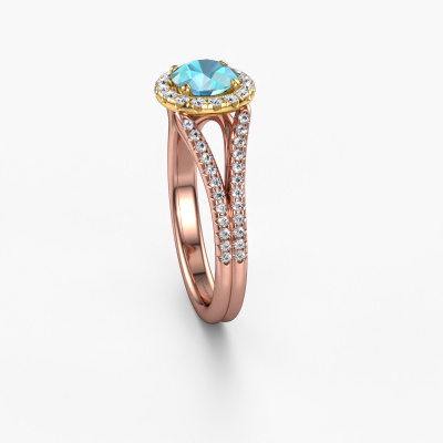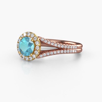 This 14 Carat rose gold ring is called Verla rnd 2 and is set with 6.5 mm blue topaz. This exclusive rose gold halo engagement ring is a true work of art! The ornaments are crafted with a lot of patience and great passion. In order to create this ring with great precision, this craft requires a keen eye and skilful hand. A challenge which ignites a fire in our expert goldsmith. The exquisite blue topaz are set in a special way so they stand out even more. This gives the ring an even more glamorous appearance. The split band engagement ring is actually unique on its own because of the gemstones which we carefully select especially for this ring. On top of that you select the precious metals which will be used to create a unique ring for the most extraordinary woman in your life! This jewel is made just for you, with attention to detail and design.Because we design and deliver our own rings, we can offer you a engagement ring at a price you won't find anywhere else. A ring is made to order, which helps prevent excess supplies, so we can make you a great price offer. We understand it feels risky, buying your engagement ring online, but we will gladly assist in the designing process, taking your budget into consideration.Our team adds new designs to our online collection daily. Our designers and goldsmiths work together in creating the best design. We strive to offer a diverse collection of jewels. Perhaps you have a specific jewel design in mind. One you came across somewhere. Please contact us for a free consultation. We will make you an offer, based on a fair price/ quality ratio, that will baffle you.To make it easier for you, we offer a 30 day return policy. Check our terms and conditions.