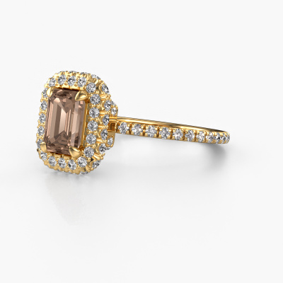 The ring shown above is called the Talitha EME. We call this type of ring a halo ring because it has one centre gemstone and a band that is also pave set with gemstones. The 14 Carat gold engagement ring is set with a emerald cut 1.15 crt brown diamond centre stone and the band is pave set with lab-grown diamonds. What makes this luxury gold halo ring special are the smaller sized stones embracing the centre stone. This gorgeous engagement ring is called a halo ring because the smaller gemstones give the centre stone a halo of surrounding light. In order for the smaller stones to enhance the centre stone, they have to be placed so there is no interference of light. And that's when our expert goldsmiths come in. Each individual stone is carefully set in the ring by hand. During manufacturing, light fall is constantly monitored to make sure the special halo is still visible. In the end you get a unique engagement ring, with a brown diamond of your choosing at its centre. You can imagine the effect of a ring of such significance when you give it to her on her special day to shine. By using our modern techniques, we can design and customize the finest quality jewels with the utmost care for you. Our engagement rings are always priced 30 percent lower than other jewellers. We make engagement rings to order so we don't have to maintain a large stock. If you have a certain budget, we are more than happy to advice you accordingly.Our team adds new designs to our online collection daily. Our designers and goldsmiths work together in creating the best design. We strive to offer a diverse collection of jewels. Perhaps you have a specific jewel design in mind. One you came across somewhere. Please contact us for a free consultation. We will make you an offer, based on a fair price/ quality ratio, that will baffle you.To make it easier for you, we offer a 30 day return policy. Check our terms and conditions.