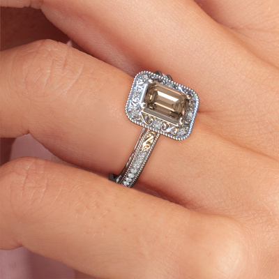 This platinum ring is called Alice EME and is set with 1.35 crt brown diamond. An extraordinary platinum vintage ring. One that will surely make the love of your life shine like a diamond! That is what we hope to achieve. This vintage Engagement ring is set with exquisite brown diamond. Whichever gemstone you choose from our selection, is up to you. The gemstone is selected with great care because we believe your pearl edges Engagement ring must be adorned with nothing but the most beautiful gemstone. Wouldn't you agree? Our expert goldsmith will design your ring in our own crafting studio, where the brown diamond will be set with great precision. The ring will then be polished till it shines perfectly. Nothing but the best for the love of your life! This jewel is made just for you by our master goldsmiths in our own studio.By using a combination of the latest modern techniques, combined with ancient crafting, we can make all our Engagement rings in our own studio. Each jewel is made to order. This is advantageous because we can offer you a price you won't find anywhere else.Do you have a specific ring in mind? One you came across somewhere. Please feel free to tell us your wishes and we will turn your design into a unique Engagement ring. You can follow the development of your ring design because we use 3D drawings. This gives you a realistic preview of your design. We will gladly send you a non-binding offer, based on a fair price/ quality ratio. It will amaze you.To make it easier for you, we offer a 30 day return policy. Check our terms and conditions.